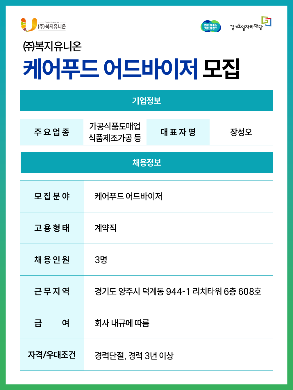 [(주)복지유니온]케어푸드 어드바이저 채용