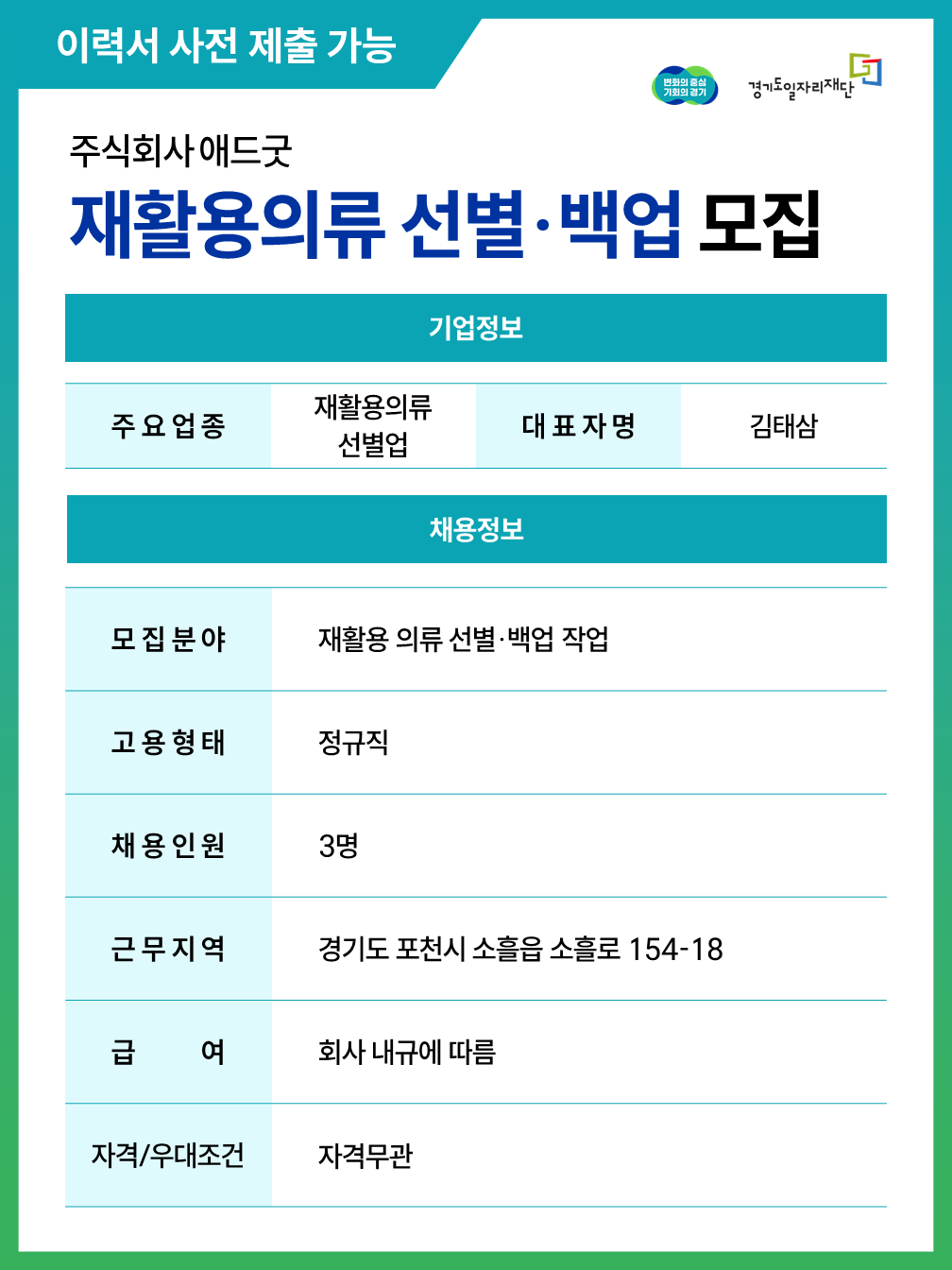 [주식회사 애드굿]재활용의류 선별, 백업 채용
