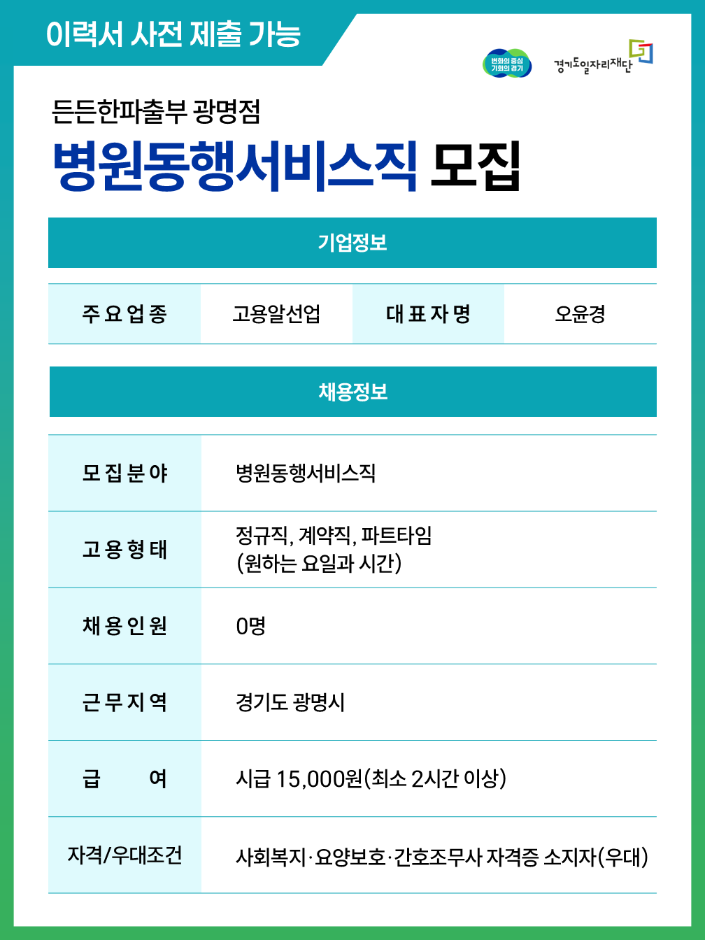 [든든한파출부 광명점]병원동행서비스직 채용