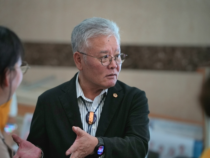 (홍원길 도의원이 일자리박람회에서 "김포 중장년이 다시 일어설 든든한 일자리 기반이 필요하다"고 설명하고 있다. (사진=홍원길 의원실 제공))