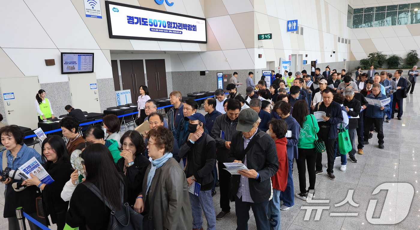 (고양=뉴스1) 이호윤 기자 = 14일 경기도 일산 킨텍스 제2전시장에서 열린 ‘경기도 5070 일자리 박람회’를 방문한 구직자들이 입장하기 위해 줄을 서고 있다. 이번 박람회는 채용기업 100여 개사와 유관기관 40개사가 참여해 50~70대 중장년층 구직자와 기업들이 직접 만나 재취업 기회를 제공한다. 2025.10.14/뉴스1